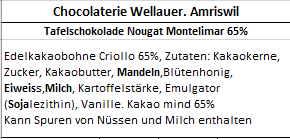 Tafelschokolade 65% mit Nougat MontelimarCHF9.80 Tafelschokolade 65% mit Nougat Montelimar Menge In den Warenkorb Kategorie: Tafelschokoladen Beschreibung Zusätzliche Informationen Beschreibung Tafelschokolade Maracaibo 65%, Kakao aus Venezuela mit Nougat Montelimar. Zusätzliche Informationen Gewicht 80 g Preis/100gr CHF 12.25 Ähnliche Produkte Tafelschokolade Maracaibo 65% CHF7.80 In den Warenkorb Tafelschokolade 72% mit Chilikrokant CHF9.80 In den Warenkorb Tafelschokolade 38% mit Caramelcrisp CHF9.80 In den Warenkorb Tafelschokolade 65% mit rosa Pfefferkrokant CHF9.80 In den Warenkorb